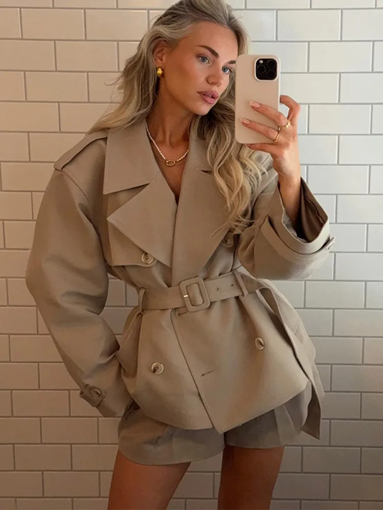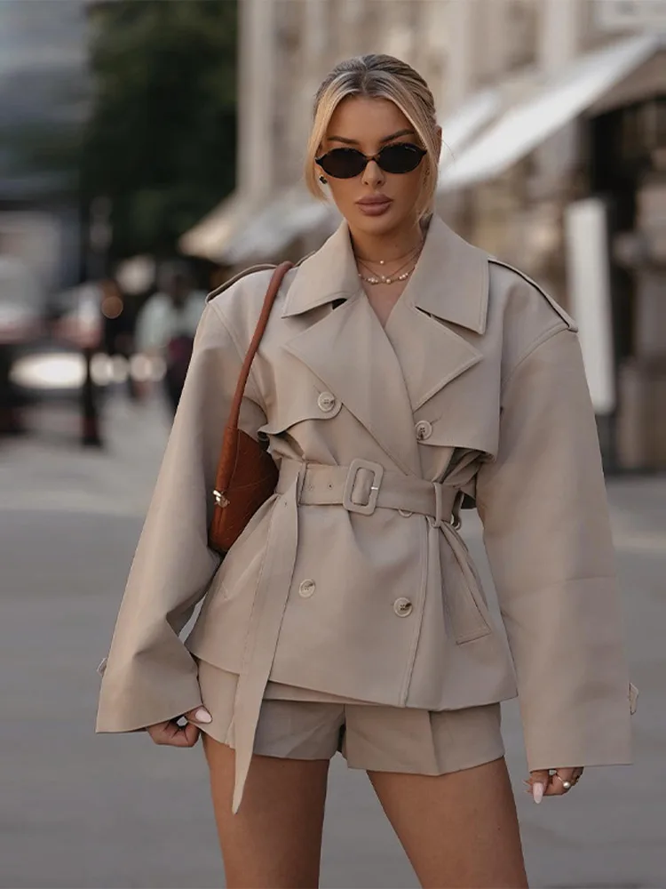 Woman Windbreaker Lace Up Trench Coats Short Pants Set Lapel Collar Outwear Ladies Jacket Autumn Tops Mini Trousers Women Suits