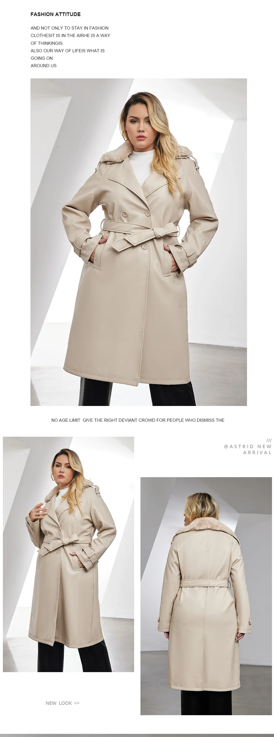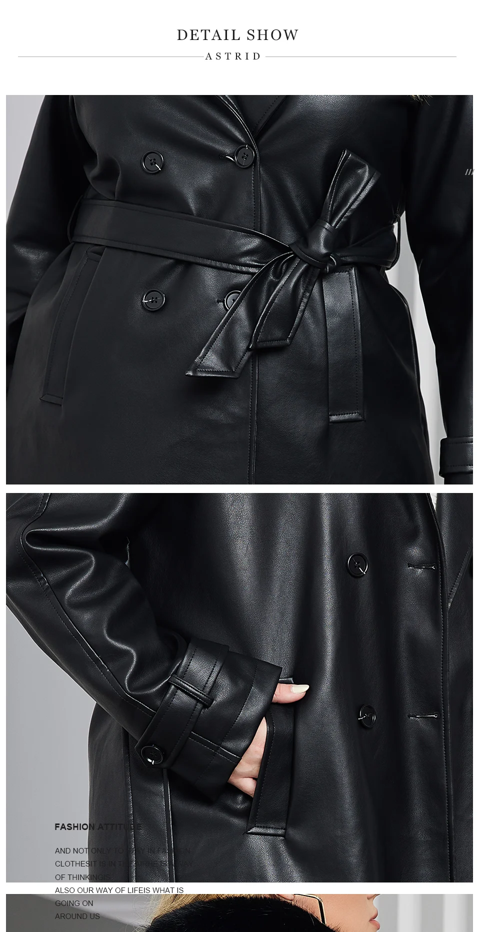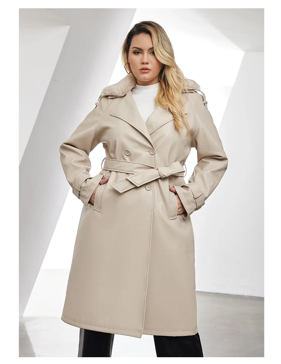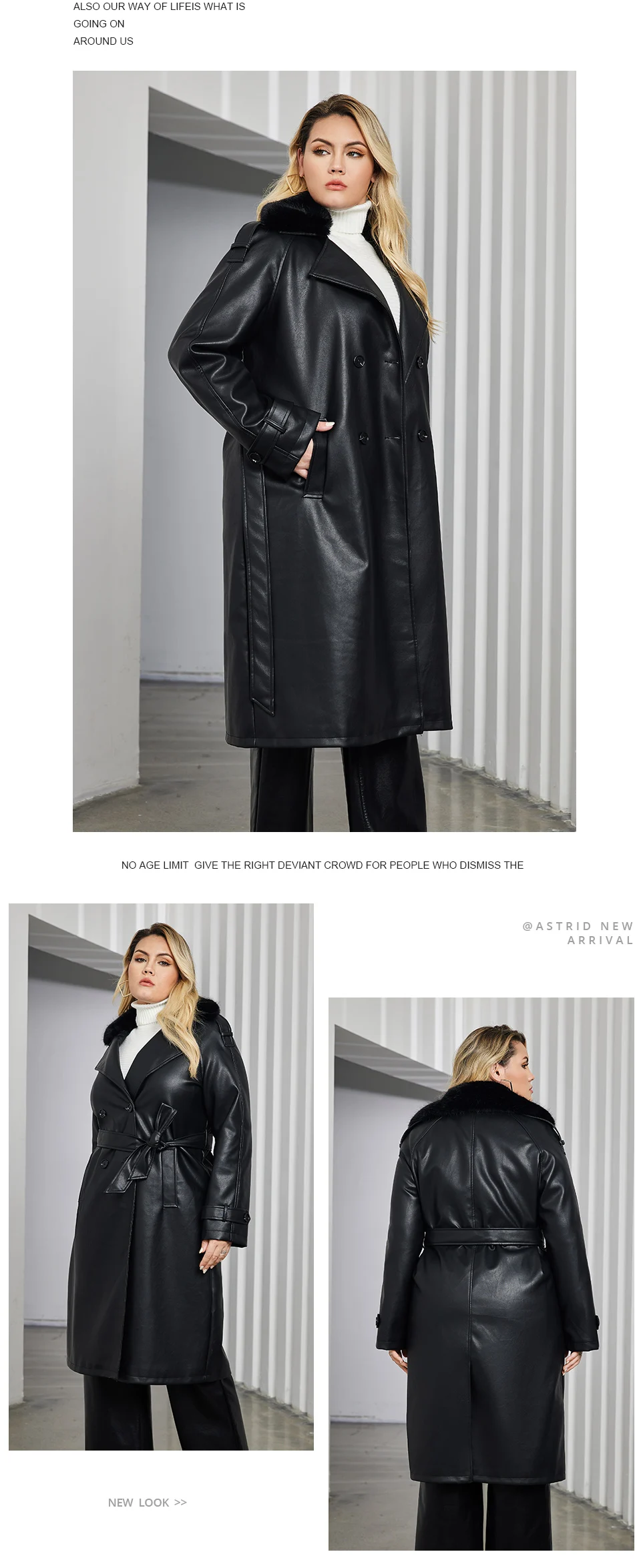 Astrid Plus Size Faux Leather Trench Coat Women Fur Collar Lapel Belt Double Breasted Loose Waterproof Jacket Fashion PU Coat