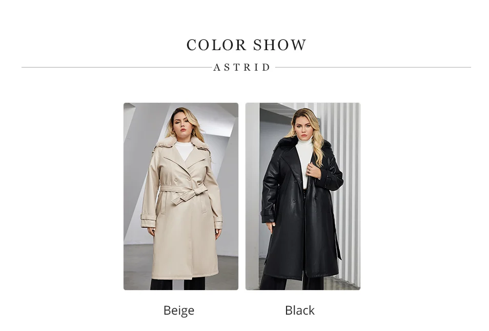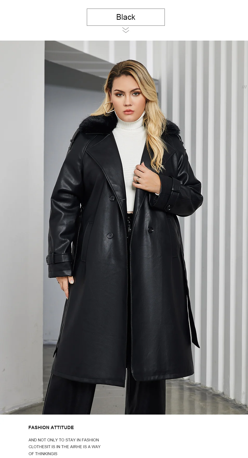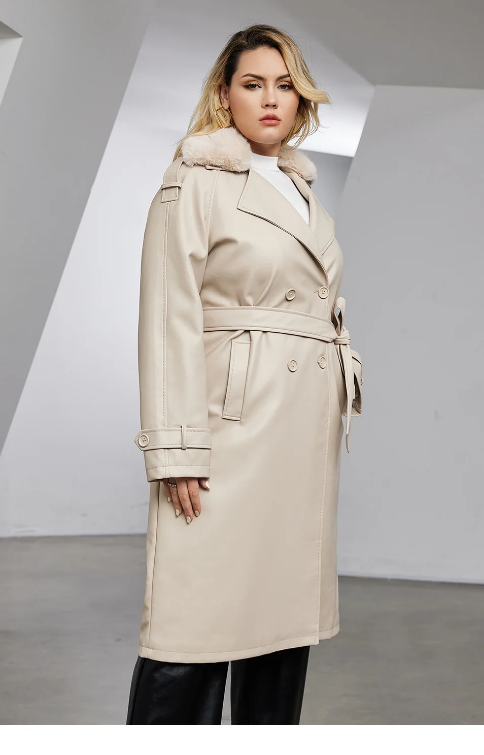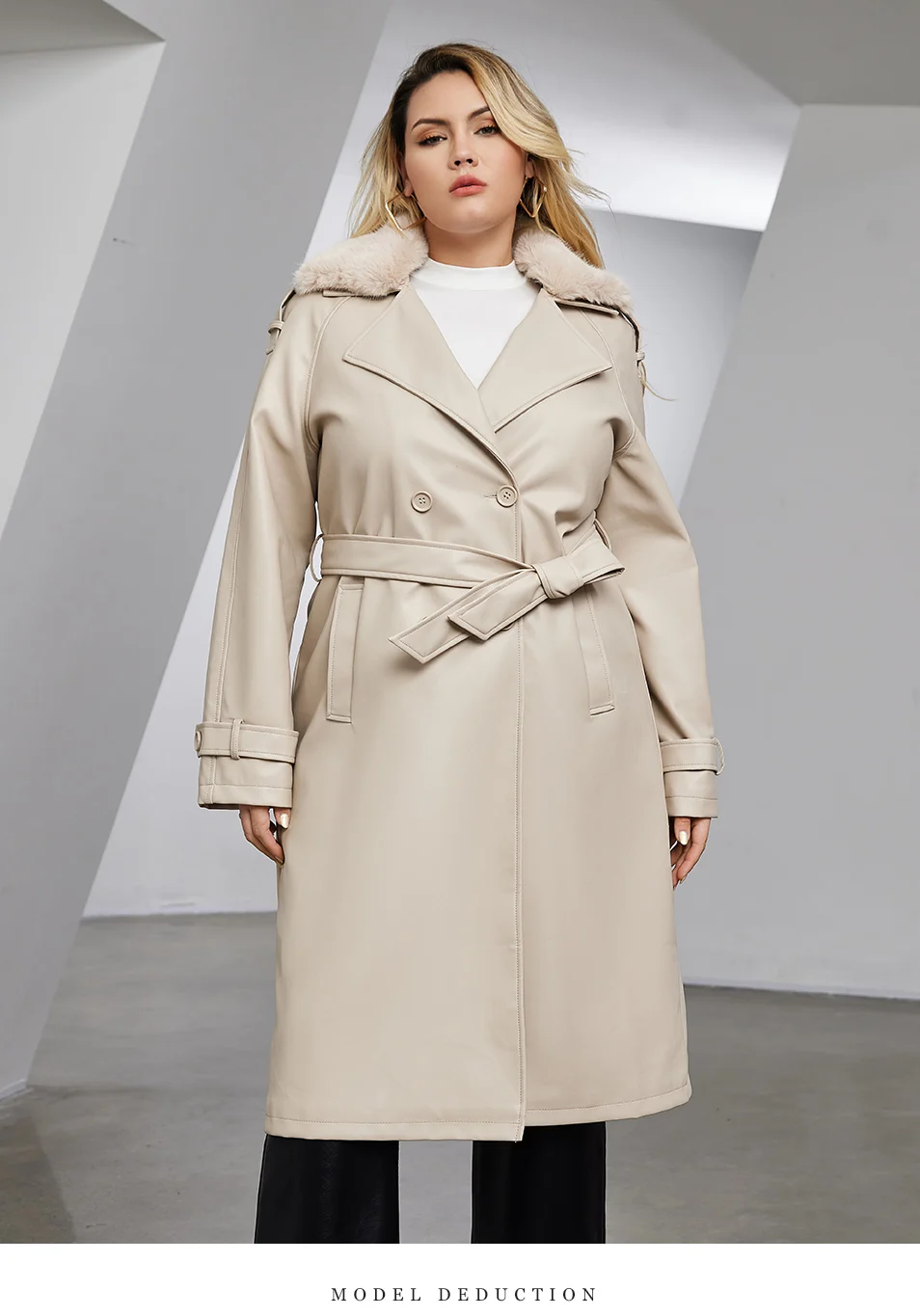 Astrid Plus Size Faux Leather Trench Coat Women Fur Collar Lapel Belt Double Breasted Loose Waterproof Jacket Fashion PU Coat