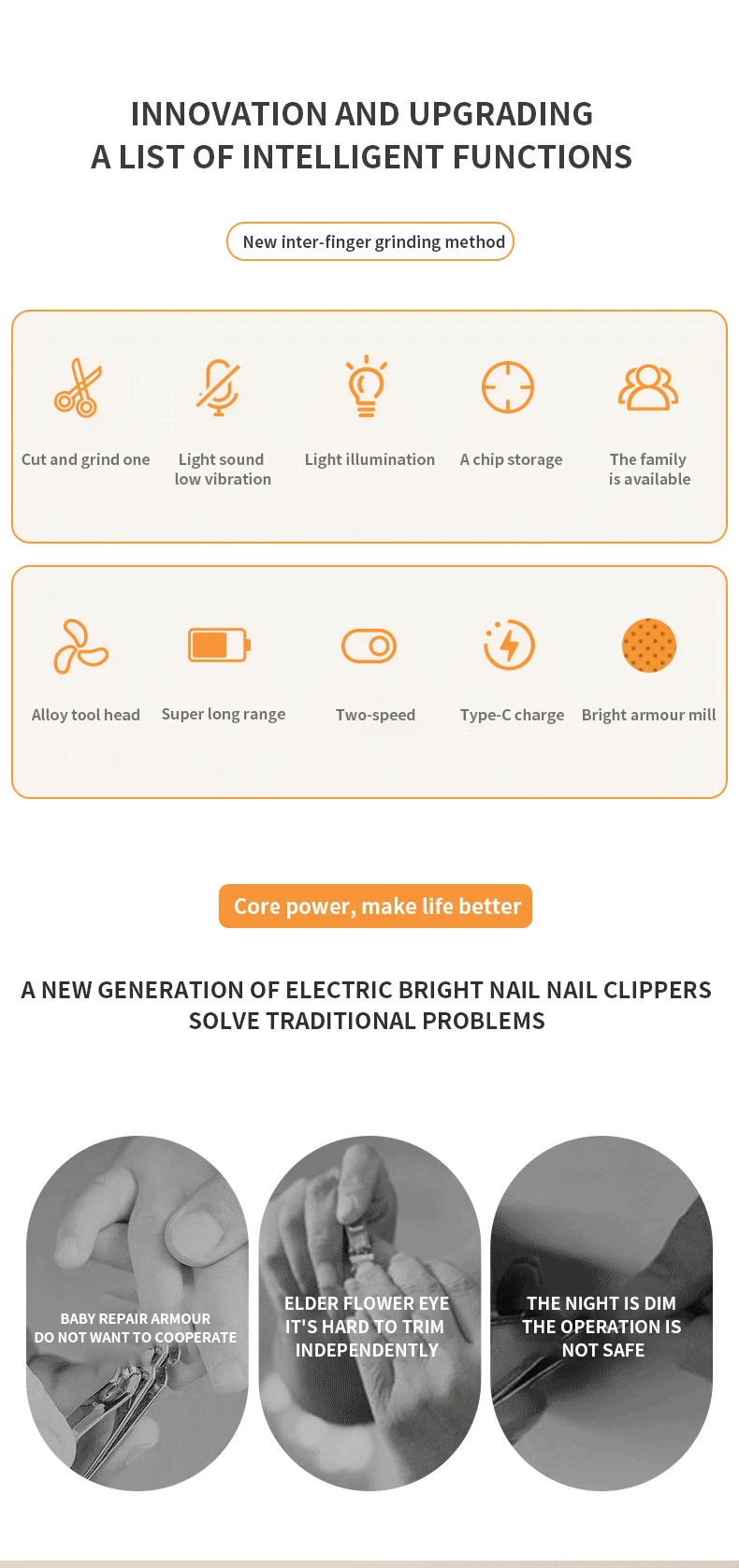1.Multifunctional electric nail scissors, trim nails + polish nails + polish nails, allowing you to easily harvest beautiful nails.